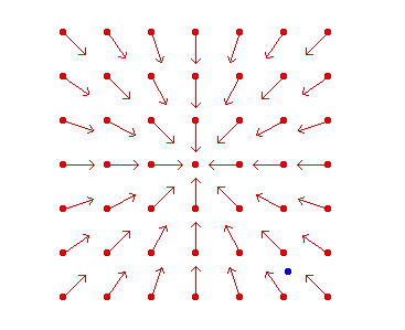 In this module we look at a two-dimensional or three dimensional situation in which the force is not constant — at different points the force may point in different directions and it may have different strengths. The figure below shows an example. Notice the force is always pointing toward the origin in this particular example.