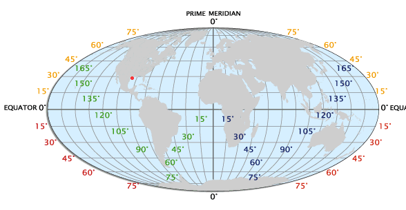 Longitude (shown as a vertical line) is the angular distance, in degrees, minutes, and seconds, of a point east or west of the Prime (Greenwich) Meridian. Lines of longitude are often referred to as meridians.